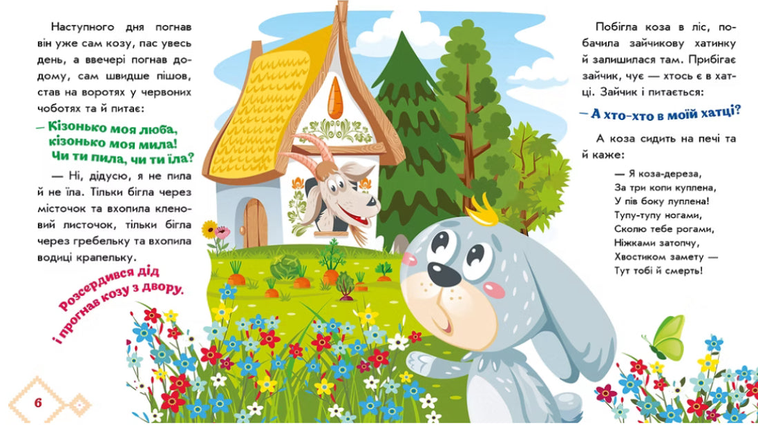 Казки знайомлять малечу з навколишнім світом, вчать розрізняти добро і зло, а ще — передають мудрість багатьох поколінь. Розгорнувши книжку "Коза-дереза" серії «Українські казочки», дитина порине в дивовижний світ хоробрих і кмітливих героїв, яким до снаги впоратися з будь-якими труднощами, а яскраві та веселі ілюстрації створять ефект «мультфільму на сторінках» і неодмінно захоплять уяву маленького читача.