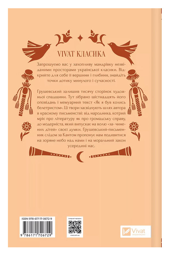 Грушевський залишив тисячу сторінок художньої спадщини. Тут зібрано шістнадцять його оповідань і мемуарний текст «Як я був колись белетристом». Ці твори засвідчують шлях автора в красному письменстві: від народника, котрий мріє про літературу як про громадську справу, до модерніста, який випускає на волю «зачинених дітей» своєї думки. Грушевський-письменник слідом за Кантом пропонує нам подивитися на зоряне небо над нами і на моральний закон усередині нас.