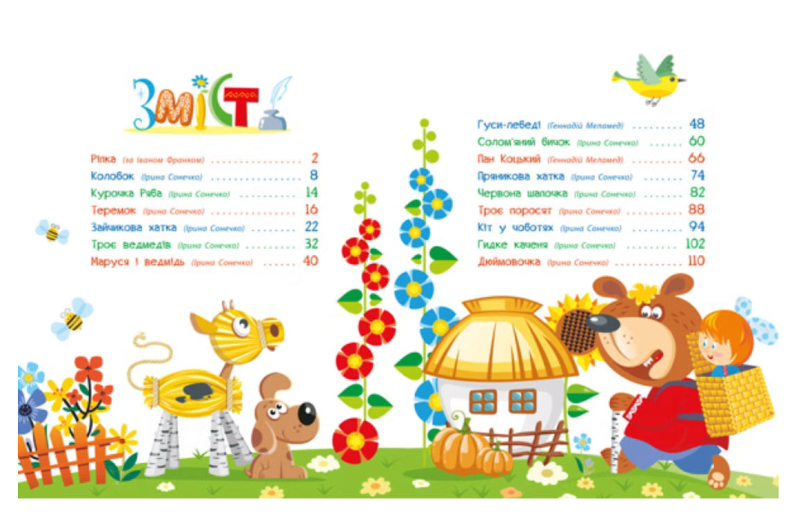 У яскраво ілюстрованій книжці — 16 найулюбленіших казок малечі, написаних у легкій поетичній формі. З цією книжкою ви проведете багато приємних хвилин, адже навіть знайомі твори у віршованих рядках стають незвичними, їх весело читати й легко вивчити напам’ять. Для кожного малюка тут знайдеться чудова історія на його вік і смак. Починається книжка з казок для найменших, а продовжується — для більш дорослих дошколяриків. Книжка вигадливо проілюстрована талановитим українським художником Віктором Корягіним.
