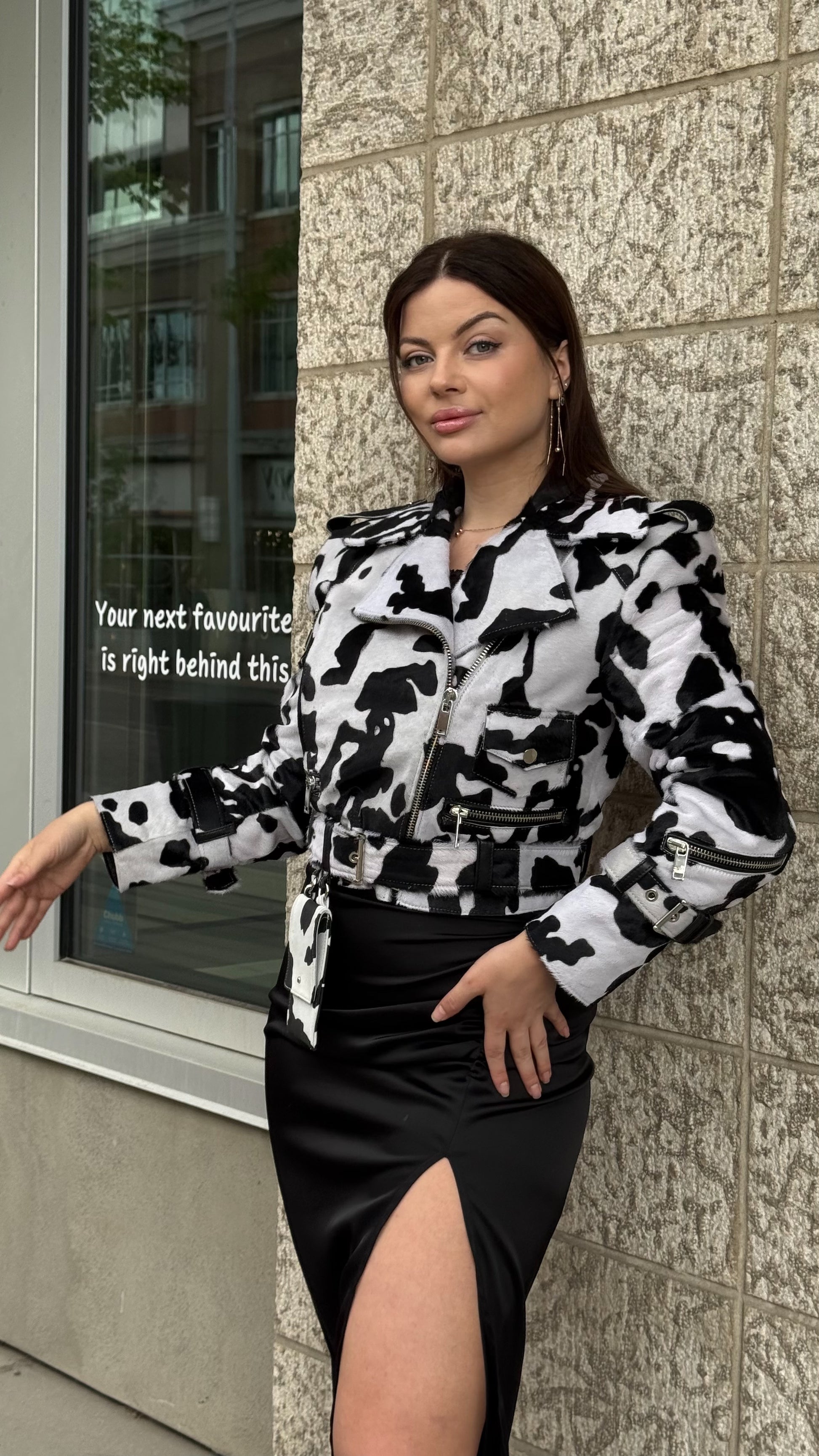 A striking biker jacket in bold black and white cavalino leather with distinctive cow print pattern. This eye-catching piece combines classic biker styling with unique animal print flair.