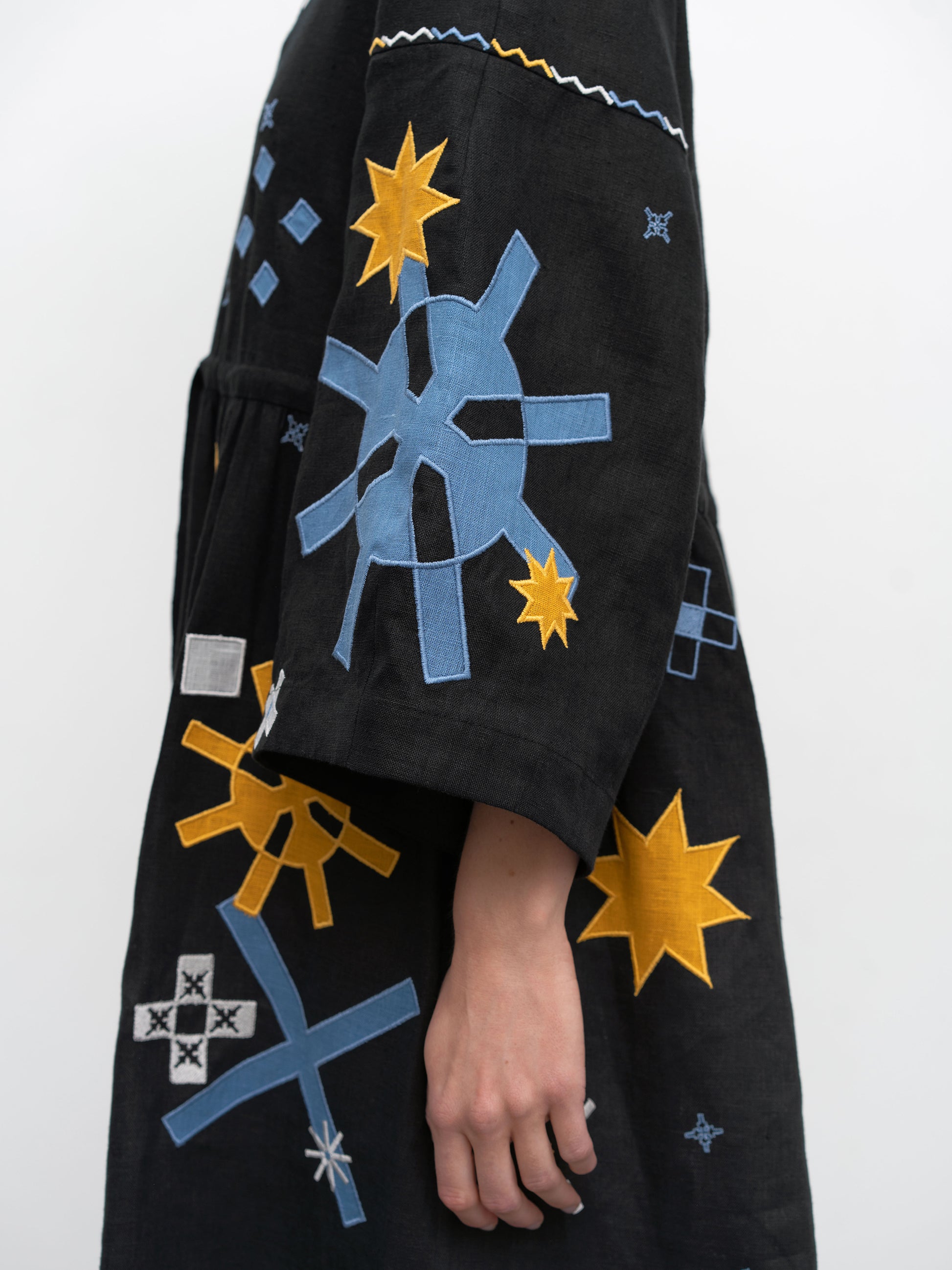 Elements of embroidery on the dress are scattered like stars in the night sky.