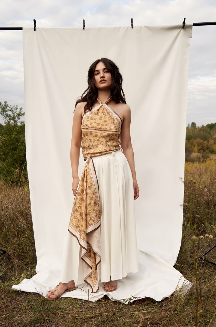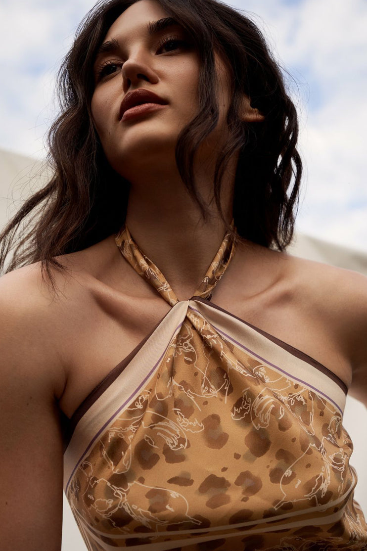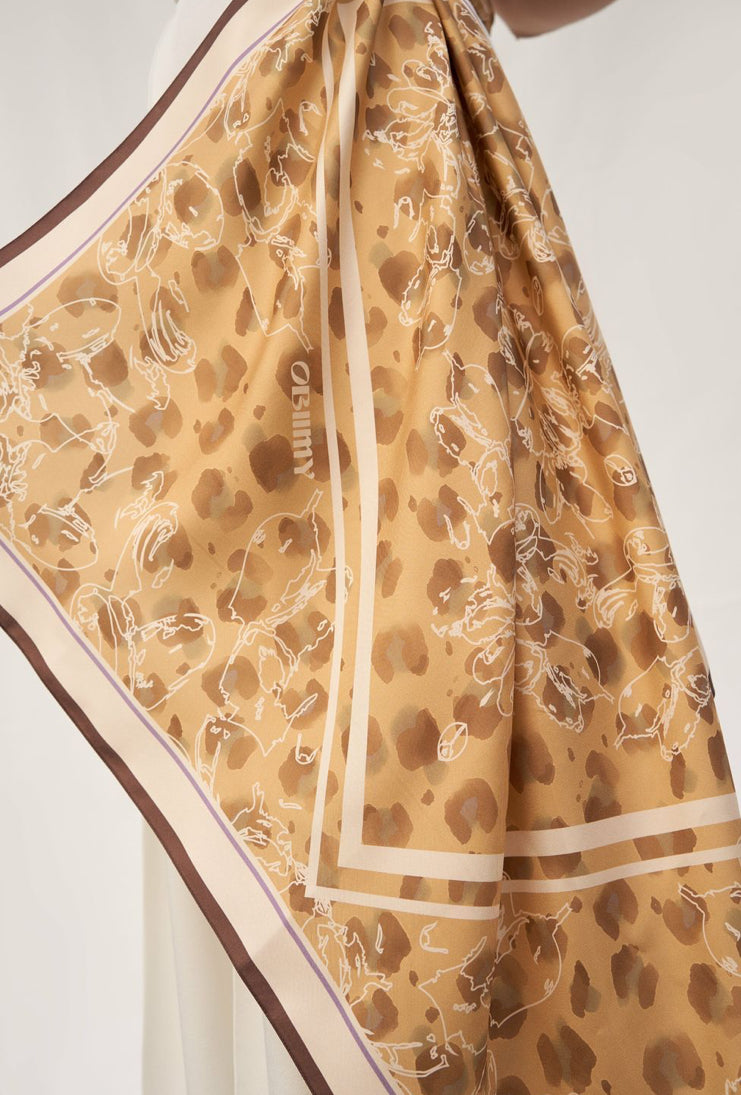 The brown tones and geometric print of the scarf add harmony and completeness to the look. It is ideal for those who are looking for calmness in details.
