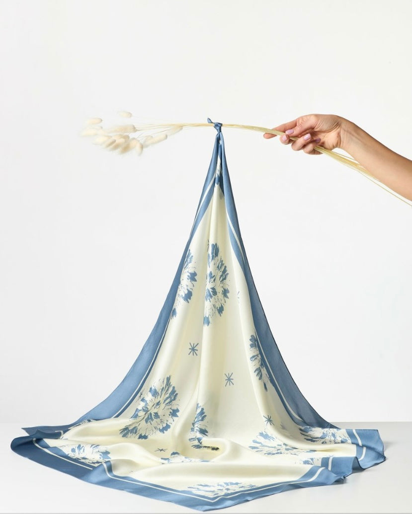 Feel the passion for every moment, the energy of life, and express your uniqueness. These are the emotions that artist Svitlana Snizhko put into her work when she painted the picture that we carefully transferred onto the softest silk. It is so soft that it feels like gentle embraces. The graceful combination of white and blue creates an effect of freshness, vigor, and light morning coolness that suits any look. Allow yourself to stand out and feel the passion for life with the scarf from "Obiimy."