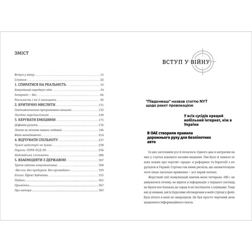 Дмитро Кулеба, міністр закордонних справ України та автор книжки на реальних прикладах пояснює п’ять принципів, які допоможуть перемогти в інформаційних війнах – про спирання на реальність, критичне мислення, керування емоціями, відчуття спільноти та взаємодію з державою. Поштовхом до написання цієї книжки стала анексія Криму та початок війни в Україні у 2014 році, в якій брехня та маніпуляції стали ключовими інструментами. Ці принципи захисту в гібридній війні не змінилися з 2014 року, вони ті самі і ще більш актуальні після повномасштабного вторгнення.